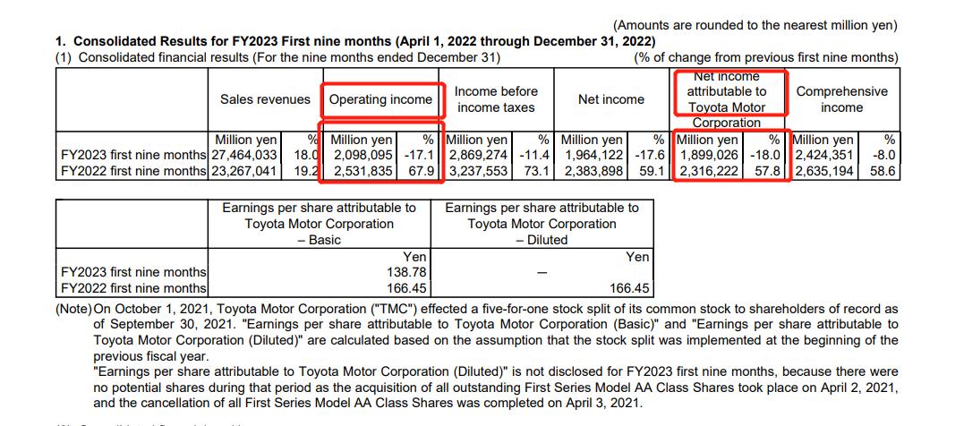 昨日,丰田汽车发布了2022年4月—12月合并财报。财报显示,其净利润比上年同期减少18%,为18990亿日元。在产量计划方面,丰田已将财年的产量目标从去年11月的970万辆下调至910万辆。