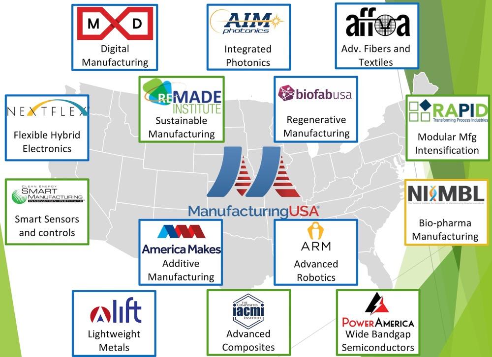 一个例子是“国家制造业创新网络”,它以“研究所”为节点,得到了美国能源部、国防部和商务部的资助。目前,这些研究所有14家,囊括半导体、光学、柔性电子器件、机器人、生物医药等领域↓