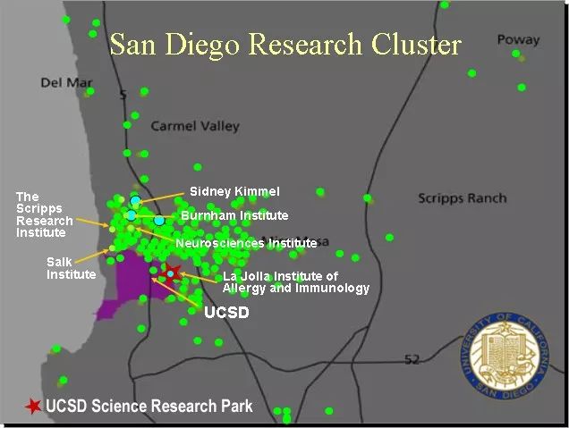 大部分的生物医药聚集区,都少不了NIH的影子。美国排名前三的生命科学集群——圣地亚哥,这里聚集了超过100家拥有千位员工以上的大型基因检测企业,有超过1100家的生命科学领域的公司,是名副其实的“基因之城”。