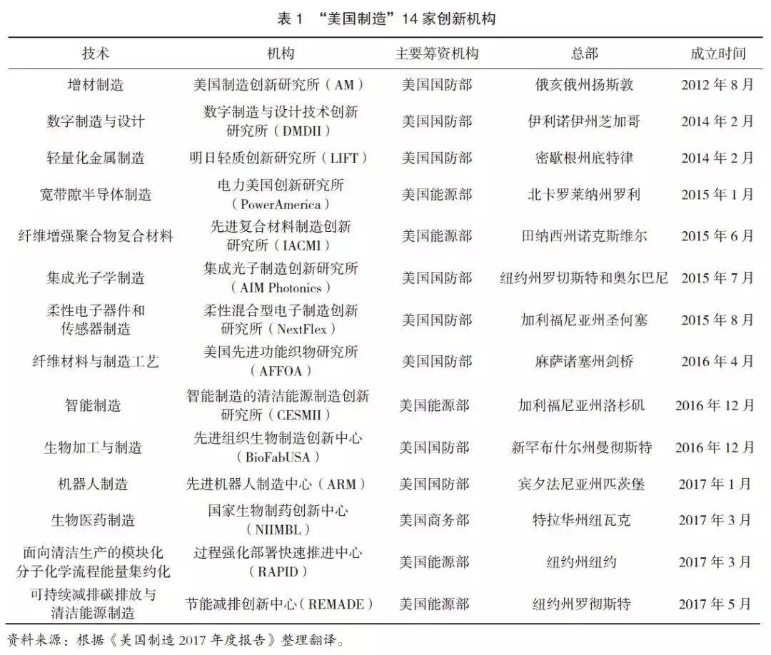 另外,为了加强制造业的网络化创新,美国政府竭力促进的公私合作,通过建立“研究所”来促进制造业集群的发展。