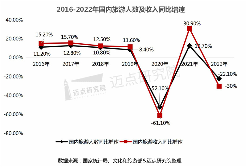 2019年以前,国内旅游收入同比增速高于国内旅游人数同比增速,以2020年为转折点,出现旅游收入同比增速低于旅游人数同比增速的“反转”现象;伴随疫情影响减弱、居民旅行需求的释放,2021年国内旅游收入同比增速重回高于国内旅游人数同比增速的状态;2022年,疫情持续不断,全国经济下行、失业裁员现象频发,人们收入大幅下降,旅游消费支出缩减,国内旅游收入同比增速低于国内旅游人数同比增速,二者相差约8个百分点。