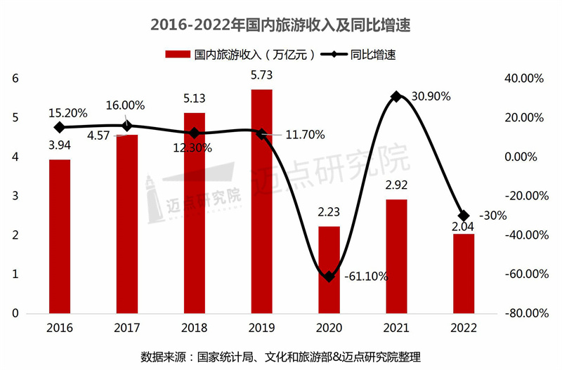 2022年,国内旅游收入占全年GDP比重为1.69%,跌破2%,较2021年降低0.85%,为疫情三年来最低。未来,伴随疫情管控的全面解除、出境游重启,在各级政府及文旅部门一系列的纾困、帮扶及促消费政策作用推动下,旅游业将逐步加快恢复,为满足人民群众美好生活的需要和经济社会发展作出新的更大贡献。
