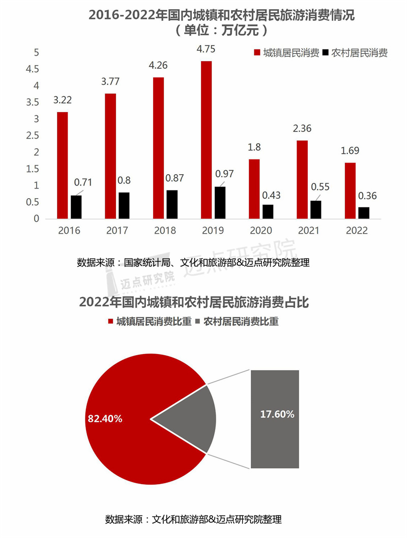 从城乡和农村居民旅游消费看,2022年城镇居民旅游消费1.69万亿元,同比下降28.6%,占旅游总收入的82.4%;农村居民出游消费0.36万亿元,同比下降35.8%,占旅游总收入的17.6%。从2016年至2022年的旅游消费数据可知,城镇居民依然是旅游消费的主力军和旅游收入的主要来源,且城镇居民与农村居民旅游消费差距整体呈缩小趋势。