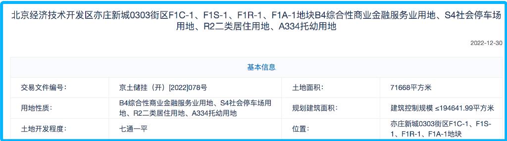 北京越新此次竞得的地块为:北京经济技术开发区亦庄新城0303街区F1C-1、F1S-1、F1R-1、F1A-1地块B4综合性商业金融服务业用地、S4社会停车场用地、R2二类居住用地、A334托幼用地。