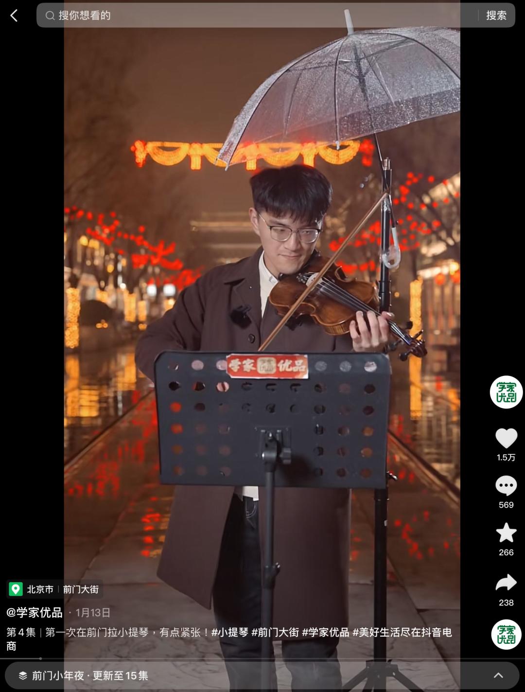 20多天前的小年前夜,夜色深沉,冬雨夹杂着寒意,北京正步入这个冬季的最冷时刻。与前门大街的火树银花形成参差的是,一把透明伞下,学家优品主播流畅在冬雨中拉起了小提琴,《这世界那么多人》和《茉莉花》的悠扬旋律随即晕染开来,吸引不少游客驻足倾听。雨中拉琴的短视频下,有网友留言:“茉莉花香从岁月深处,丝丝缕缕,缓缓流出”,“仿若破晓前的那束光,温柔且有力量”。