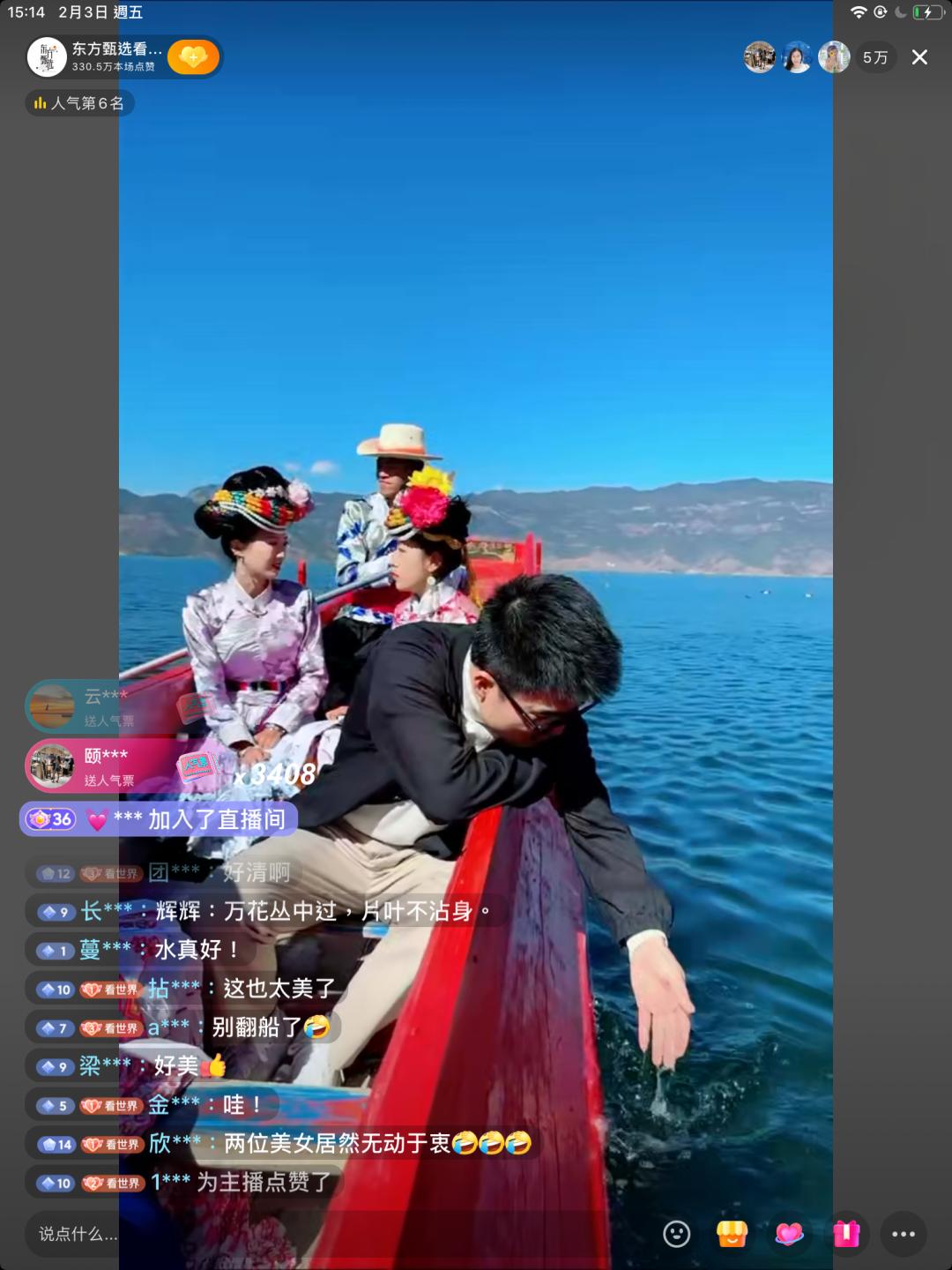 主播们和当地导游一起泛舟泸沽湖,截图自东方甄选看世界直播间