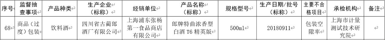 2021年7月,上海市市场监督管理局发布相关通报,在针对商品(过度)包装的监督抽查中,有4批次酒类产品不合格,不合格项目涉包装空隙率,涉小糊涂仙、郎牌、杜康等知名品牌。