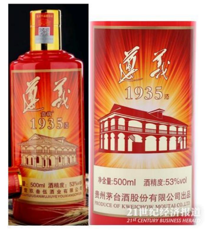 前两年,贵州茅台旗下的酱酒产品“遵义1935”,招到同行高仿——一家名为“玖先生酒水专营店”的抖音网店,大肆售卖一款和“遵义1935”外形非常相似,名为“遵义贵载1935”的白酒。