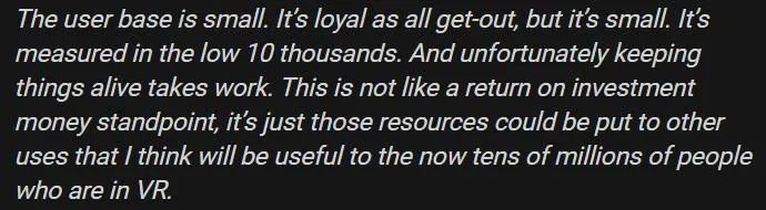 Boswoth 表示,自己对不得不关停「Echo VR」感到难过,但他必须要同时考虑回本问题,而且自己说到的“回本”指的是让相关人员有条件开发能够吸引和影响更多用户的新产品。