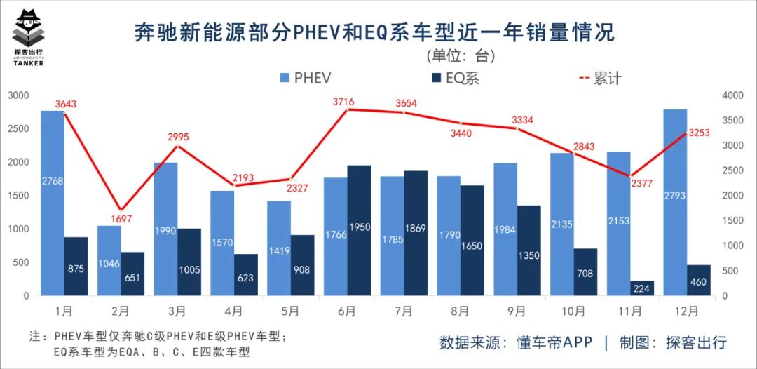 从月度销售数据来看,在上半年呈现一路下滑的混动PHEV车型,竟在下半年迎来了大逆转的走势。相反,独立的纯电EQ品牌在经历了上年的停滞不前后,于年中曾出现过报复性的回暖,但在下半年里则走出现直线下滑。