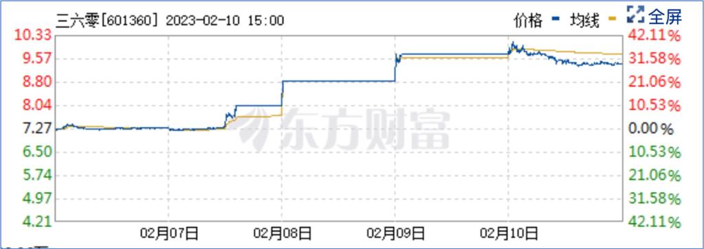 三六零的股价在2月7日至9日三天中涨停 图片来源:东方财富截图