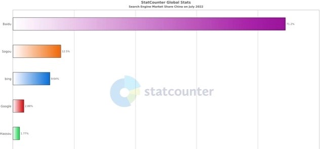 多年来,国内的搜索市场竞争与全球割裂开来,导致市场格局也有些不同。Statcounter数据显示,全球搜索引擎市场中,谷歌地位几乎不可动摇,份额占比高达92.9%,Bing以3.03%的份额排名第二,百度占比仅为0.65%。而在国内,截止2022年7月,百度在国内搜索引擎市场(全设备平台)排名第一,占比71.2%,搜狗占比12.5%,必应9.64%。