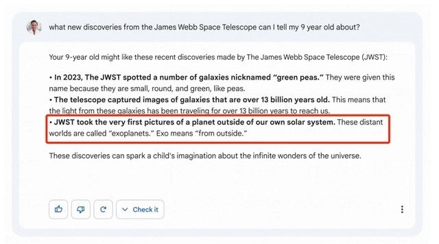 但是没曾想,最先翻车的反而是谷歌。2月8日晚,谷歌大跌超7%,市值瞬间蒸发约1020亿美元,因为Bard在回答一个有关詹姆斯·韦伯太空望远镜的问题时给出了错误答案。