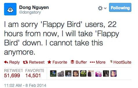 2014 年 2 月 8 日,在经历突如其来的爆红与巨大的讨论声浪之后,开发者 Dong Nguyen 发布了一条推特,表明自己再也受不了目前这与自己预想中大相径庭的讨论与热度,决定下架给他带来收入与名气的上瘾游戏 Flappy Bird。