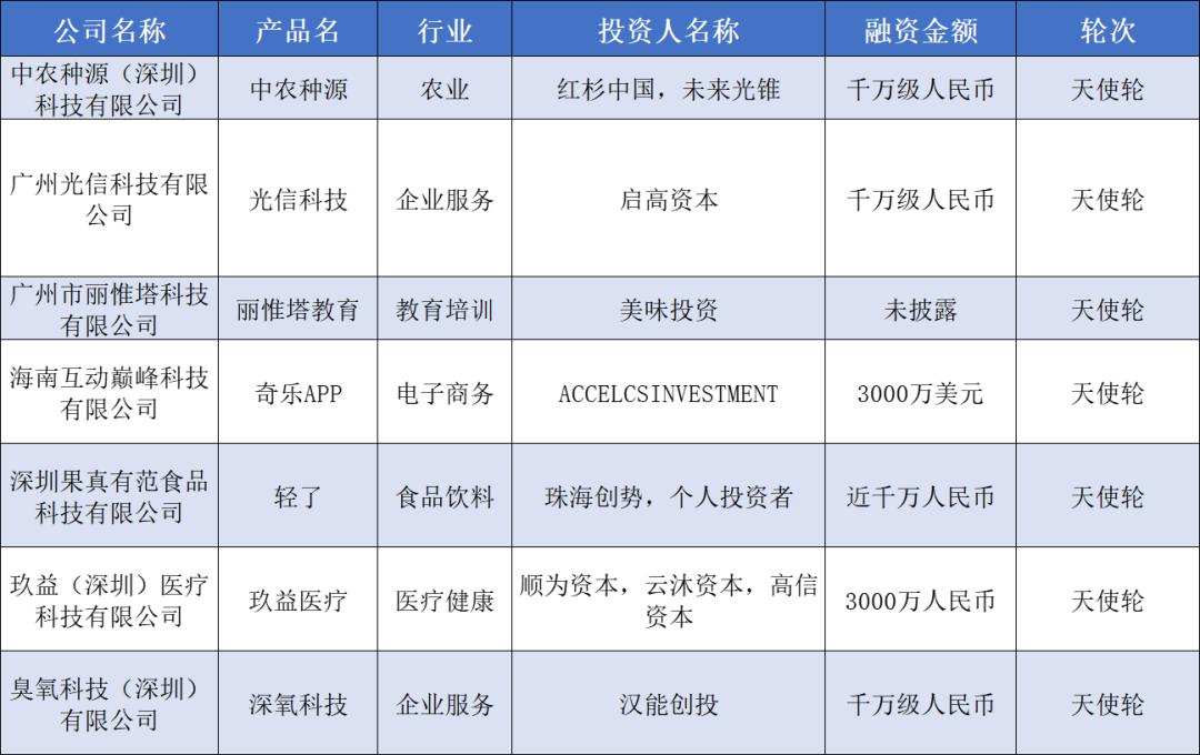 本周获得天使轮或种子轮融资的项目共有7笔,其中包括农业、企业服务、教育培训、电子商务、食品饮料、医疗健康行业。
