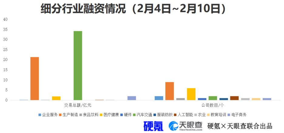 本周融资主要分布在生产制造行业;汽车交通行业披露的交易总额最多,超34.17亿元人民币。