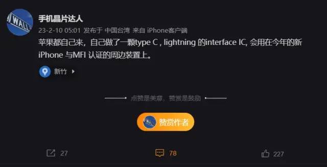不过,即便是被迫改用Type-C接口,苹果依然没有放下利用配件赚钱的想法。根据微博数码博主@手机晶片达人爆料,虽然下一代iPhone 15/ Pro/Ultra系列采用Type-C接口几乎成为定局,但是苹果为此特地设计了一颗interface IC,用户基本不用指望能随便用一根Type-C数据线给iPhone充电/传输数据。