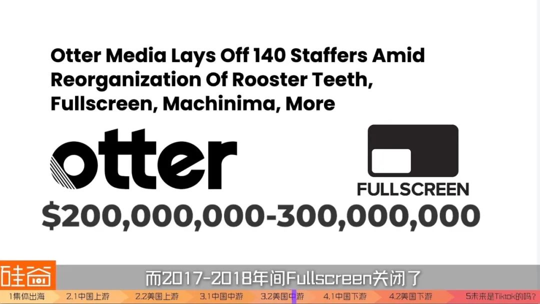 2015 年,Otter media以 2 到3亿美元的估值控股了Fullscreen。而 2017 年-2018 间, Fullscreen关闭了旗下多项业务,进行了多轮的裁员,CEO也辞职了。