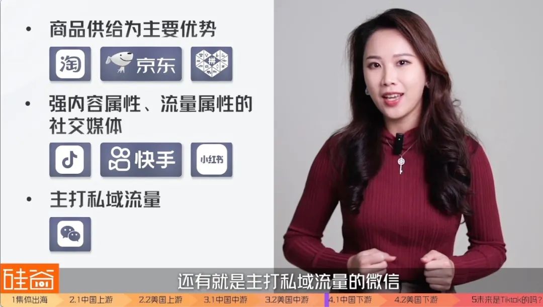 而流量的分配也是一门学问。我们这里稍微展开来说,比如在抖音和快手这两大巨头当中,发展直播电商业务的过程中,也选择了不同的路径和打法。比如抖音提出的叫“兴趣电商”,而快手提出的是“信任电商”这个概念。