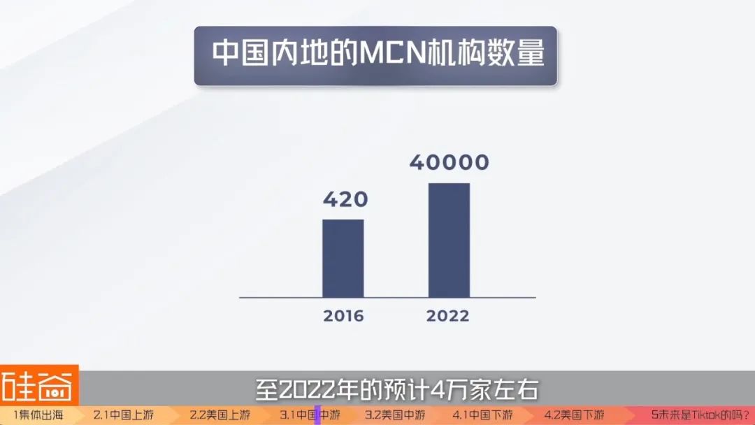 在规模方面,中国内地的 MCN 机构数量已经是由 2016 年的 420 家上升到了 2022 年的预计4万家左右。可以说,赛道已经非常非常卷了。