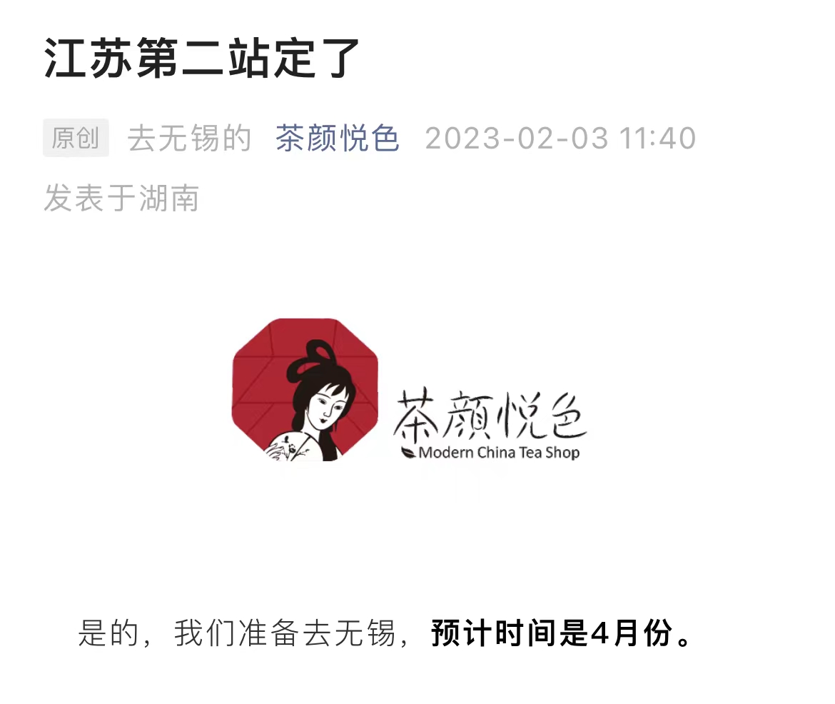 2023年伊始,茶颜悦色继续加速落实“走出去”战略。2月3日,茶颜悦色官方公众号对外宣布,2023年首个外拓城市将选择无锡,预计4月份进入,首批门店将签订在无锡海岸城、无锡万象城、无锡南长街聖塘里、无锡大悦城。