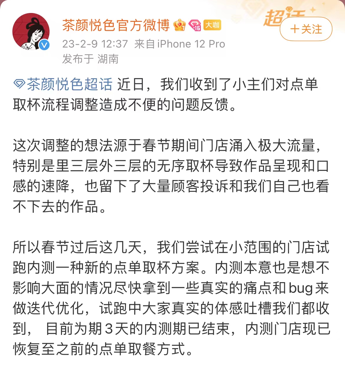 2月9日,茶颜悦色在其官方微博发文致歉称,“春节过后,尝试在小范围的门店内测一种新的点单取杯方案,目前,为期3天的内测期已结束,内测门店现已恢复至之前的点单取餐方式。”