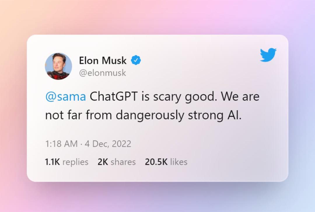 2022年12月4日,埃隆·马斯克 (Elon Musk)发了一条推文,他是这么描述的:ChatGPT有一种让人毛骨悚然的厉害,我们离危险的强大人工智能已经不远了。”