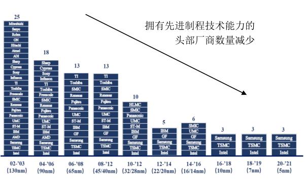 图:随着制程工艺提高,行业玩家逐渐减少 资料来源:英特尔,中信证券
