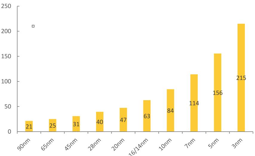 图:不同制程下每5万片晶圆产能的设备投资(亿美元)资料来源:天风证券