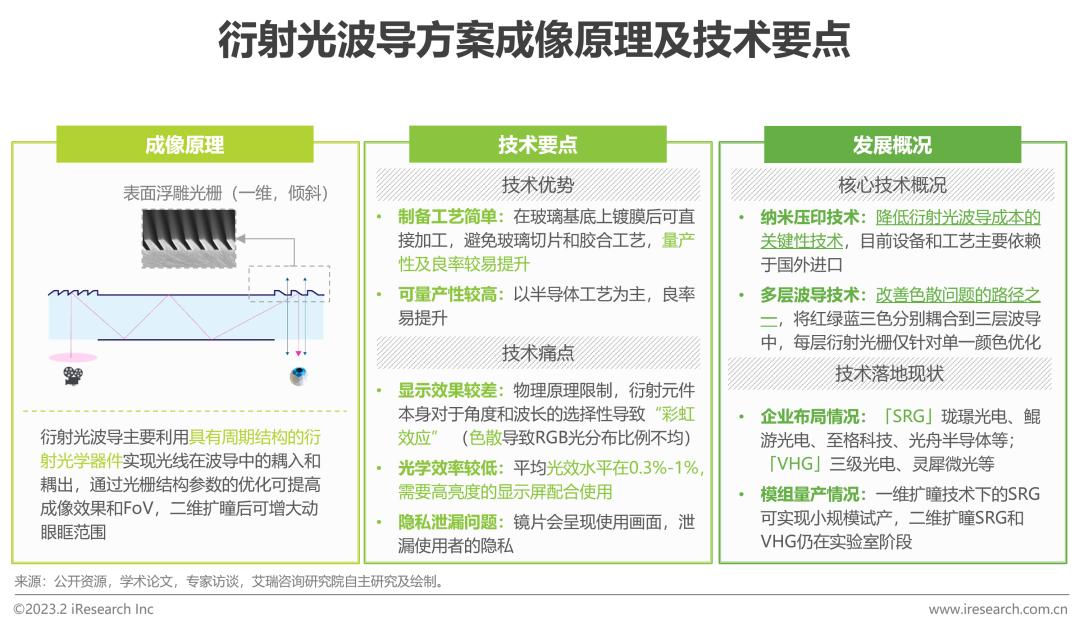 衍射光波导技术光栅设计自由度大,制备工艺较为简单,良率和可量产性较易提升。其中,目前基于表面浮雕光栅技术的成像方案(SRG)较为成熟,已实现小规模量产并投入实际应用当中。其量产难点在于母版设计的难度较大,涉及半导体微纳米级别加工工艺,需在硅基底上通过电子束曝光和离子刻蚀制成母版。部分企业尝试布局体全息光栅光波导(VHG)在单色显示方面较为有优势,但光学原理、工艺、成本等问题尚未解决,处于较为早期阶段。整体而言,主流方案为基于表面浮雕光栅的衍射光波导方案,其优势在于量产性和良率更优,行业挑战主要集中在如何在减少体积,增大FoV的同时仅用单波导片解决色散问题。