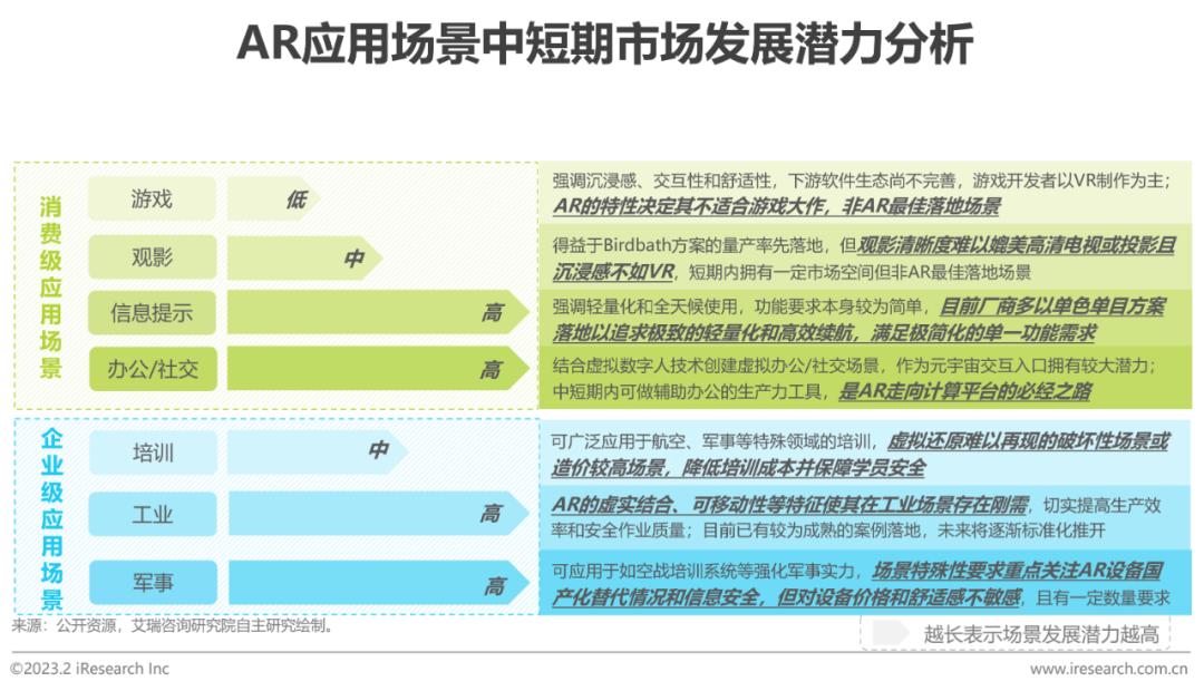 AR下游应用场景主要分为消费级应用市场(To C)和企业级应用市场(To B),目前C端场景主要涉及娱乐属性的观影、游戏场景,及偏工具属性的信息提醒和办公场景,其中观影场景发展速度最快,已有多款量产产品流入市场。B端场景主要涉及工业、教育、军事、安防、培训等场景,其中工业和培训场景已有较多成熟案例落地,其余场景仍在不断拓展阶段。艾瑞认为,目前AR市场不断加速推进经由容错高且价格敏感程度较低的B端市场验证、逐步向C端发展的进程,C端市场正逐渐崛起;但由于AR技术仍不成熟、C端已有应用场景非刚需且替代方案成熟,短期内或将面临商业变现增长乏力问题。长期来看,随着技术不断迭代,B端场景将愈发走向专业化,C端场景或将进一步细分,AR市场的快速增长和规模上量仍将依赖于C端市场的推动与爆发。