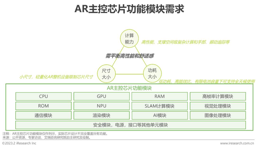 AR主控芯片主要指SoC计算芯片,需要满足终端设备在性能、功耗、连接、AI等方面的要求,为硬件设备提供操作系统运行、简单本地渲染、多传感器信息融合处理等支撑。现阶段高通的XR芯片平台方案一枝独秀,部分AR整机企业采用消费级芯片(手机、AIoT芯片)作为阶段替代方案。艾瑞认为,在中短期内将会持续两种阶段性过渡方案,但AR场景复杂的空间级计算和高品质图像处理等特殊要求仍需要AR专用芯片作为支撑。同时,为推动AR在消防、安防、工业、乃至军工领域的落地,国产化芯片方案的替代迫在眉睫。另一方面,在5G、云计算、云服务等技术在支撑下,将计算、存储等功能云化以降低本地要求可成为解决芯片桎梏的解决方案之一,但中短期内相关基础设施建设不完备、难以有效支撑。