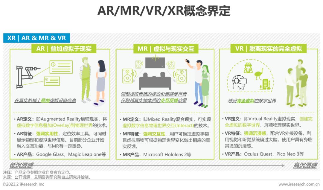 单一交互方式难以满足AR不同应用场景的综合需求,未来交互技术将向多模态、精细化方向发展。但目前AR交互技术尚未定性,目前分体式AR整机多采用手机或手柄/手环等保留机械感的方式,并配合语音交互使用,以最为成熟且学习成本较低的方案先行落地。以触控、手柄、手环交互等围绕“手”的交互方式多为主动交互,需要用户主动发出命令,精准度较高且普适性高,部分技术较为成熟已优先落地;而以眼动追踪、面部识别等为代表的、无需用户额外操作的交互方式,更加自然、学习成本更低但目前技术仍不成熟,仅作为辅助交互方式。艾瑞认为,AR交互技术没有孰优孰劣之分,交互方式的选用和场景需求特征强关联,在细分场景下不适宜的交互技术叠加只会是“炫技”,增加成本的同时却没有优化体验。如办公场景则仍需保留机械式输入方式以提高生产效率;社交场景则更注重全面交互性,需要多模态交互技术融合支撑等;游戏等复杂操作场景对延时、精准度等要求较高故以手柄为主。