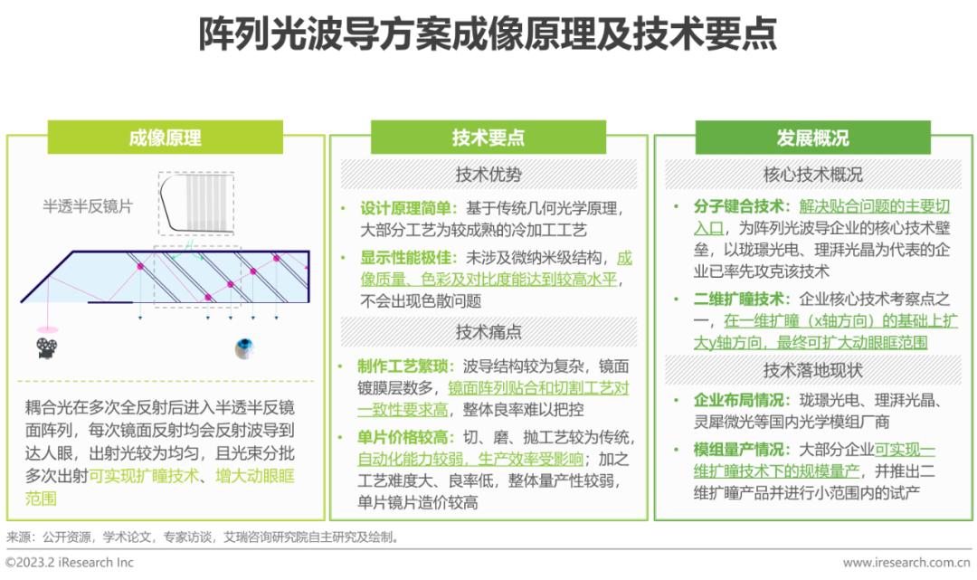 国内初创企业布局阵列光波导较多,阵列光波导需要扩瞳技术,目前已解决一维扩瞳设计技术和量产的难题实现小规模出货,转向攻克二维扩瞳技术的落地。应用二维扩瞳技术的阵列光波导方案能够有效增加出瞳距离和动眼眶范围,在减轻光机体积的同时增大FoV至50度以上,为阵列光波导方案推广至消费级AR应用提供了可能性。目前二维扩展设计的难点在于阵列反射镜序列加工工艺需采用冷加工工艺,对光学加工的精度和一致性要求较高。整体而言,阵列光波导在延续光波导优良性能的基础上,拥有杂散光少、能量分布均匀、FoV较大等优势,但制备工艺繁琐且环环紧扣,良率的提高相对困难。