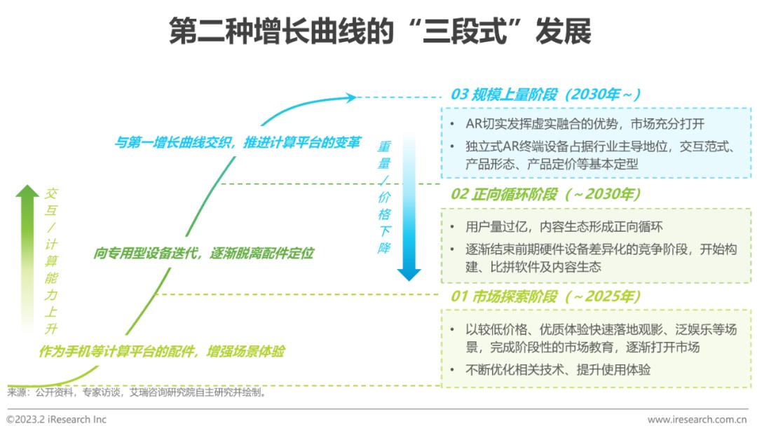 AR终端设备的迭代路线大致可分为两种,第一种增长曲线:追求大而全的「All in one」通用型设备,第二种增长曲线:追求小而美的、专攻于某一个特定细分领域的「One by one」专用型设备。目前以Microsoft的Hololens系列和Magic Leap的产品主要沿着第一种增长曲线迭代,产品单价高昂,而以国内厂商为代表的企业更顺应第二种增长曲线模式。艾瑞认为,第二种增长曲线将会成为中长期的主流路径,并随着行业不断向前推进,逐渐与第一种曲线交织、重合。在第一阶段或将针对某一重点领域切入并深耕,在击穿该场景后迁移至新的专用场景开始二次成长;第二阶段持续“滚雪球”、优化产品能力、挖掘新的应用场景,逐渐完成从专用设备到通用设备的过渡;第三阶段独立式AR终端设备范式基本确定,推进计算平台的变革。