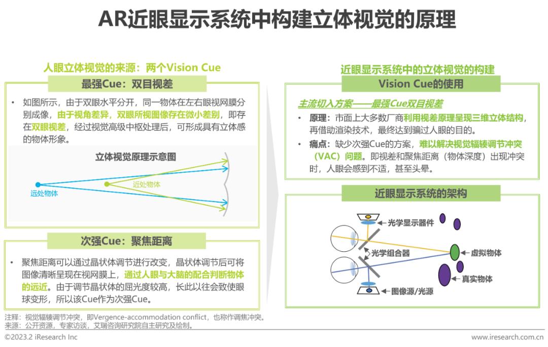 为实现“现实的增强”即交互沉浸感,AR近眼显示系统NED(近眼显示系统:Near Eye Display)需构建在还原人眼立体视觉的基础上。人眼立体视觉是指人眼辨别周围物体间的距离、深度和体积的能力,主要来源于两个Vision Cue。目前市面上主流切入方案为通过最强Cue双目视差构建近眼显示系统,其中核心模块为(1)光学模组(2)光源(3)光学显示器件。