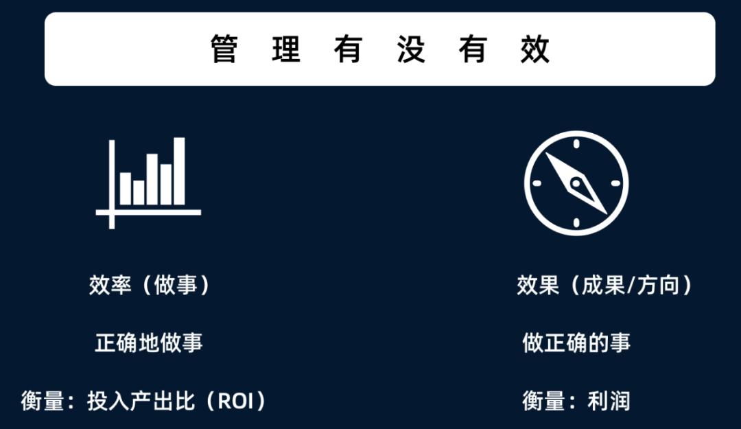 效率意味着“正确地做事”,效果意味着“做正确的事”。管理的有效性既追求效率更追求效果,即“正确地做正确的事”。