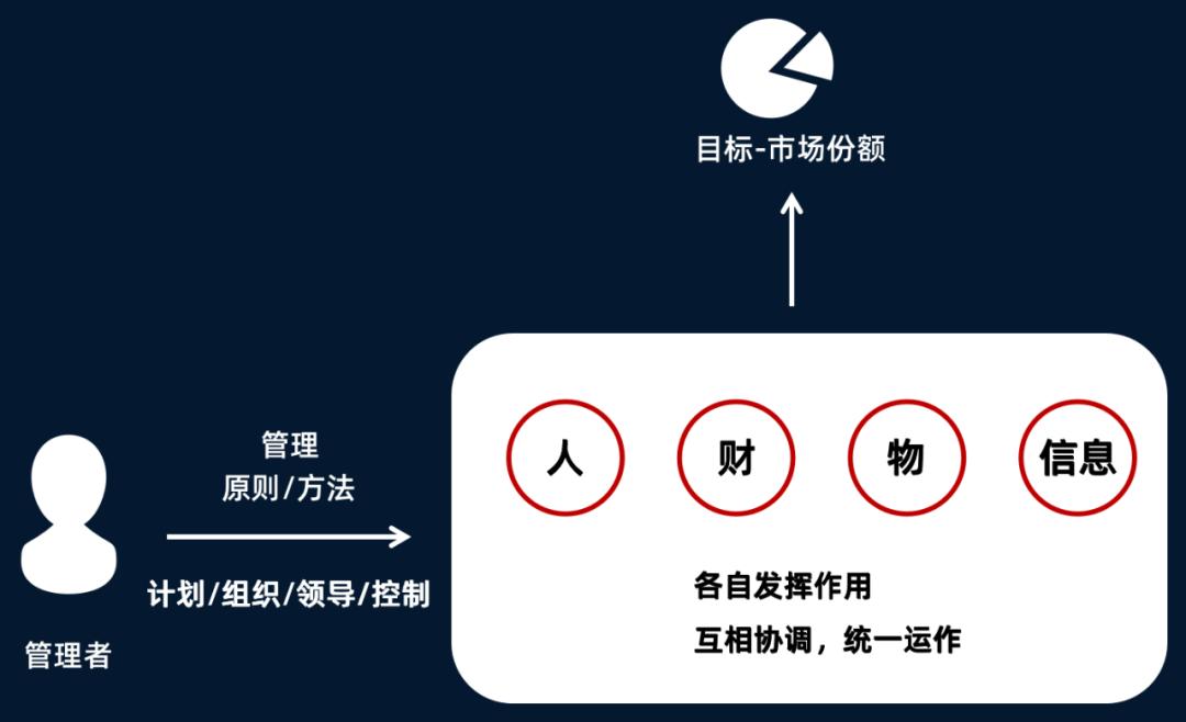 管理者为了有效率和有效果地实现目标,依照管理原则、方法,对企业的“人、财、物、信息等各种资源进行计划、组织、领导、控制,让其各自发挥作用,互相协调,统一运作,以实现盈利目标。