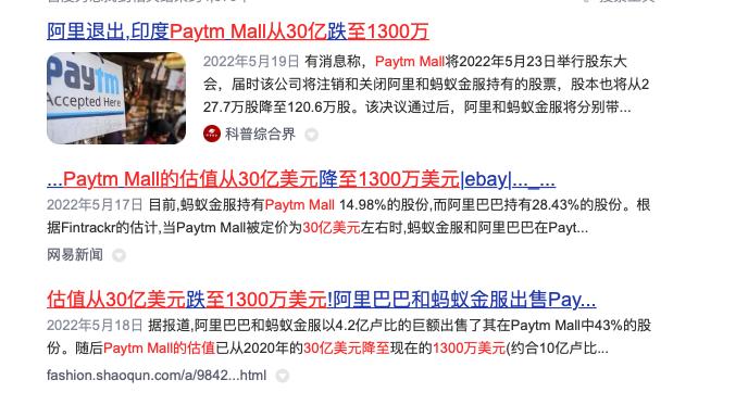 22 年的 5 月,更是爆出阿里和蚂蚁金服被曝退出 Paytm Mall ,也就是正在和亚马逊、沃尔玛进行电商大战的印度第三大电商平台。