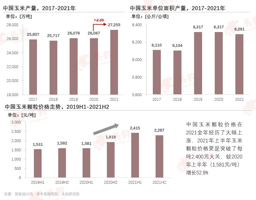 玉米是生产味精最主要的原材料,其供给与价格的平稳直接决定味精行业的产量与价格。以味精头部企业阜丰集团为例,玉米采购占其味精生产成本近六成。2017-2021年间,中国玉米产量呈现平稳增长的趋势,玉米总产量由2017年的25,907万吨增长至2021年的27,255万吨。同一时期,中国玉米单位面积产量突显上升趋势,由2017年的每公顷6,110公斤增长至2021年的每公顷6,291公斤。