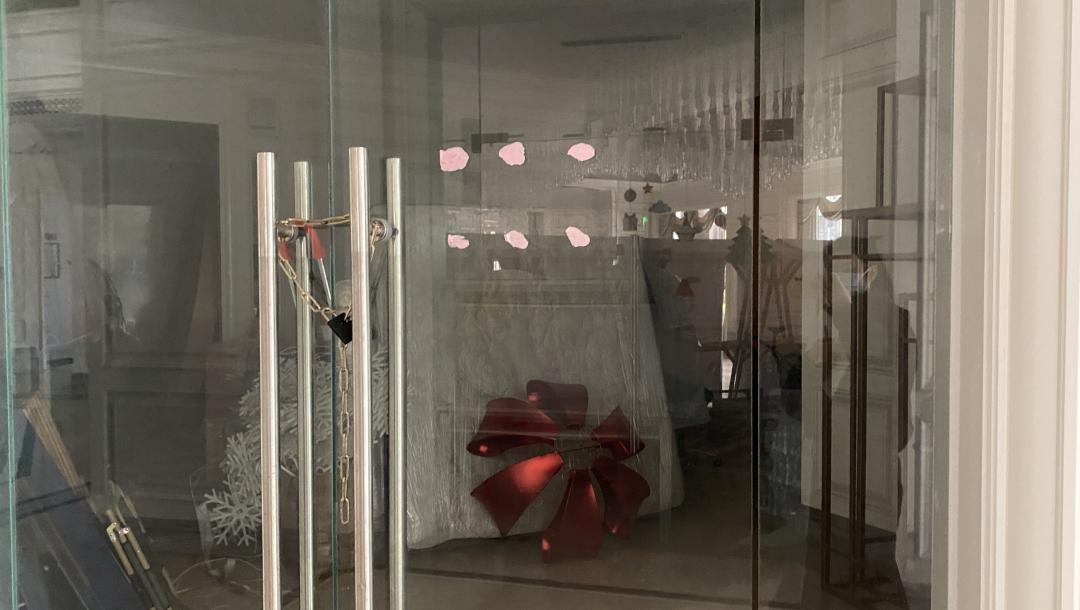 有的紧锁大门,隐约还可以看到被扔在一旁的装饰花朵 。