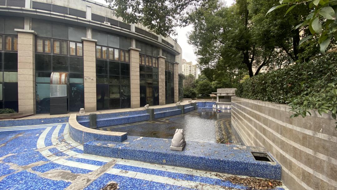 中心喷泉两旁杂草丛生,室内也都堆满了建筑垃圾 。