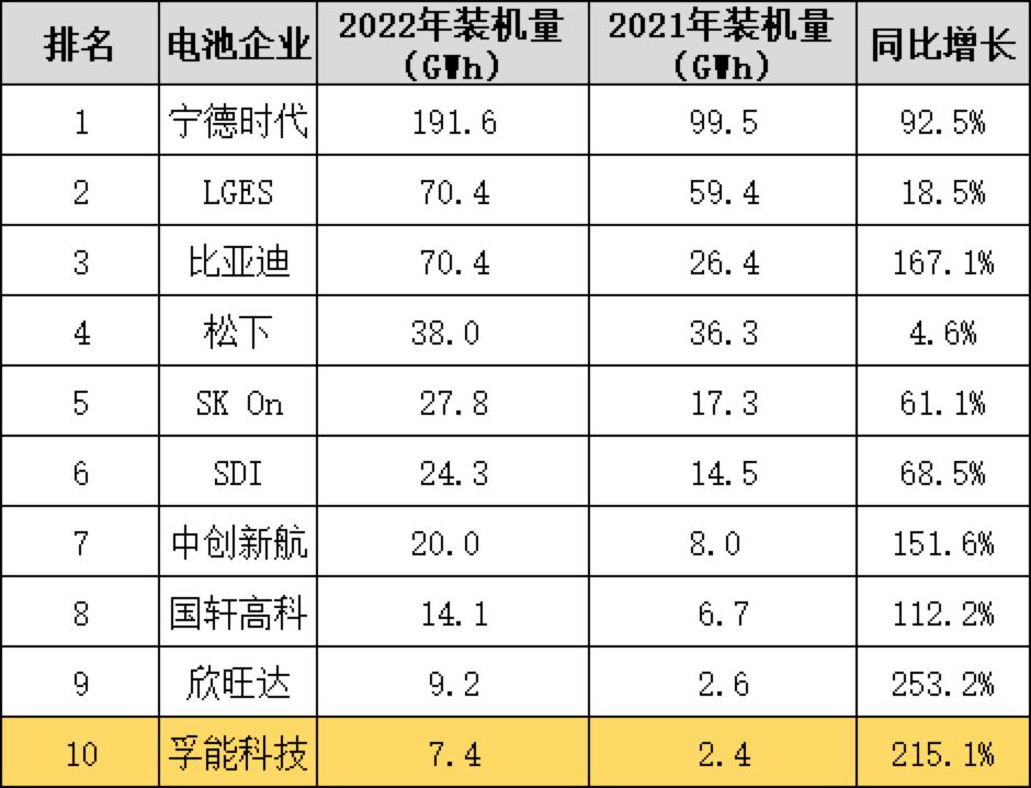 如果将视野拓宽至全球市场,在2022年全球出货量排名中,得益于奔驰EQ系列在欧洲销量的强劲增长,孚能科技以超高增长率成功跻身全球TOP10。动力电池装机量7.4GWh,同比增长215.1%。