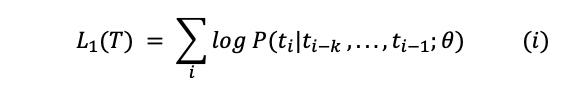 其中 T 是无监督数据 {t_1,…,t_n} 中的标记集,k 是上下文窗口的大小,θ 是使用随机梯度下降训练的神经网络的参数。