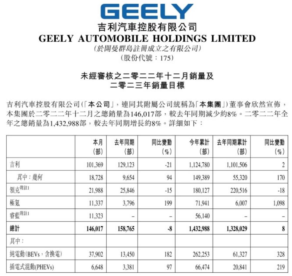 2022年吉利的全年销量目标为153万辆,实际销量为143万辆,为国内第3。拉长时间看,吉利已是连续5年未能达成销量预期,尽管总量上升,增速却不及其它头部车企。