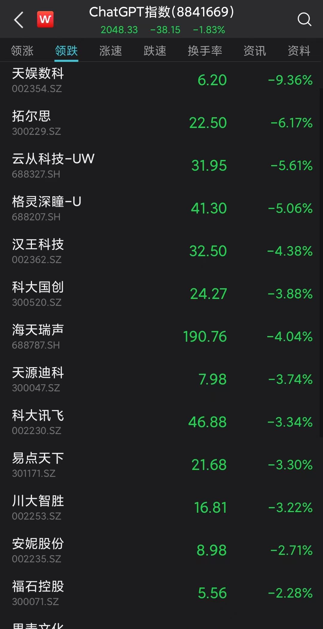 ChatGPT概念股开盘走低,天娱数科、光云科技跌超8%,拓尔思、汉王科技、云从科技、科大讯飞等跌超3%。