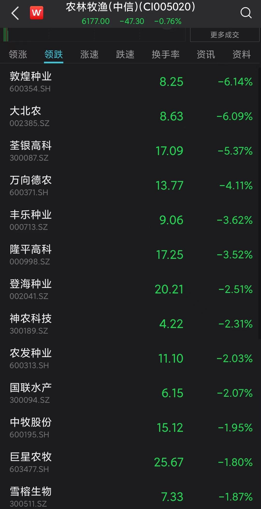 农业股开盘走低,敦煌种业跌超7%,荃银高科、万向德农、丰乐种业、隆平高科等跌超3%。