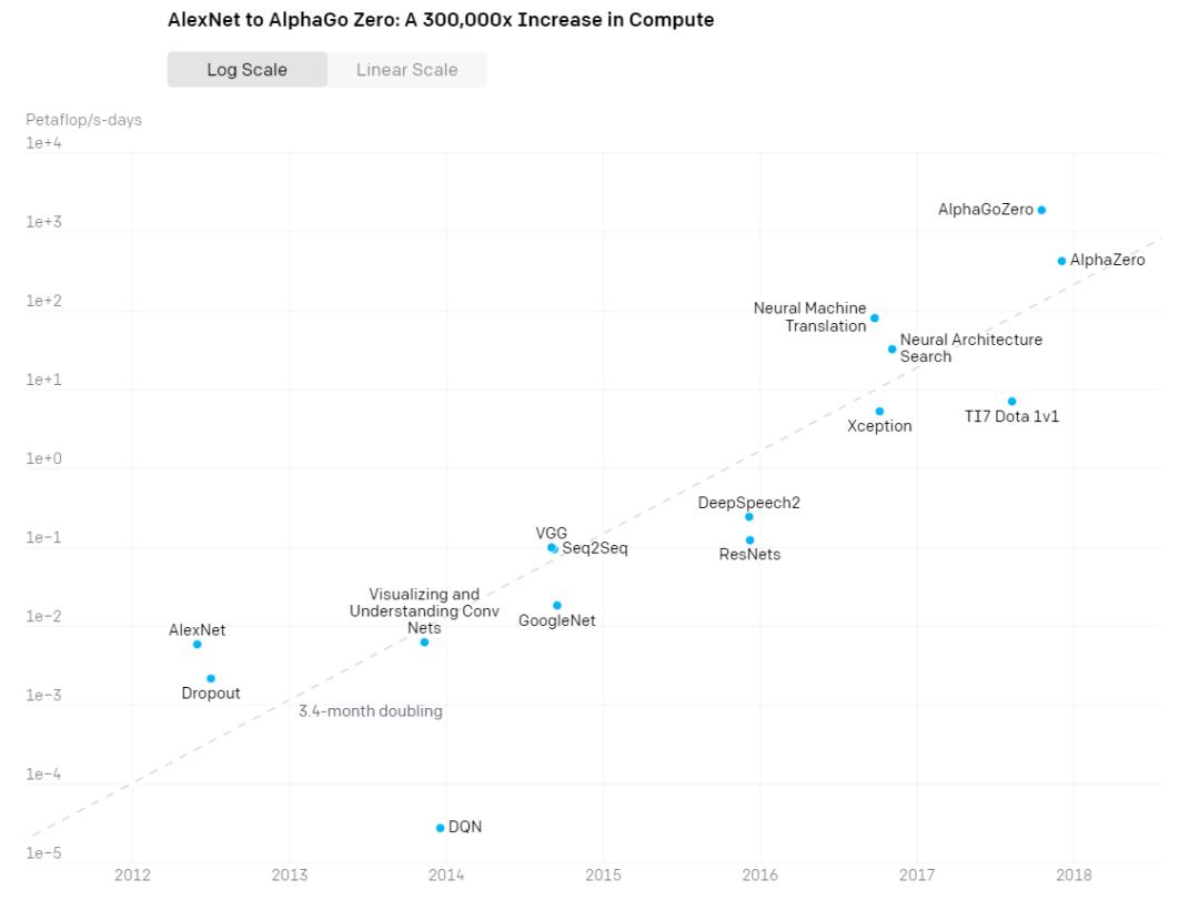 一个热知识是,如果没一个出手阔绰的靠山,根本没资格搞AI。光算力——也就是芯片的开销,就是一笔巨额成本。从2012年的AlexNet模型到2017年的AlphaGoZero,算力消耗足足翻了30万倍。同期英伟达股价翻了整整15倍,黄仁勋做梦笑醒好几回。