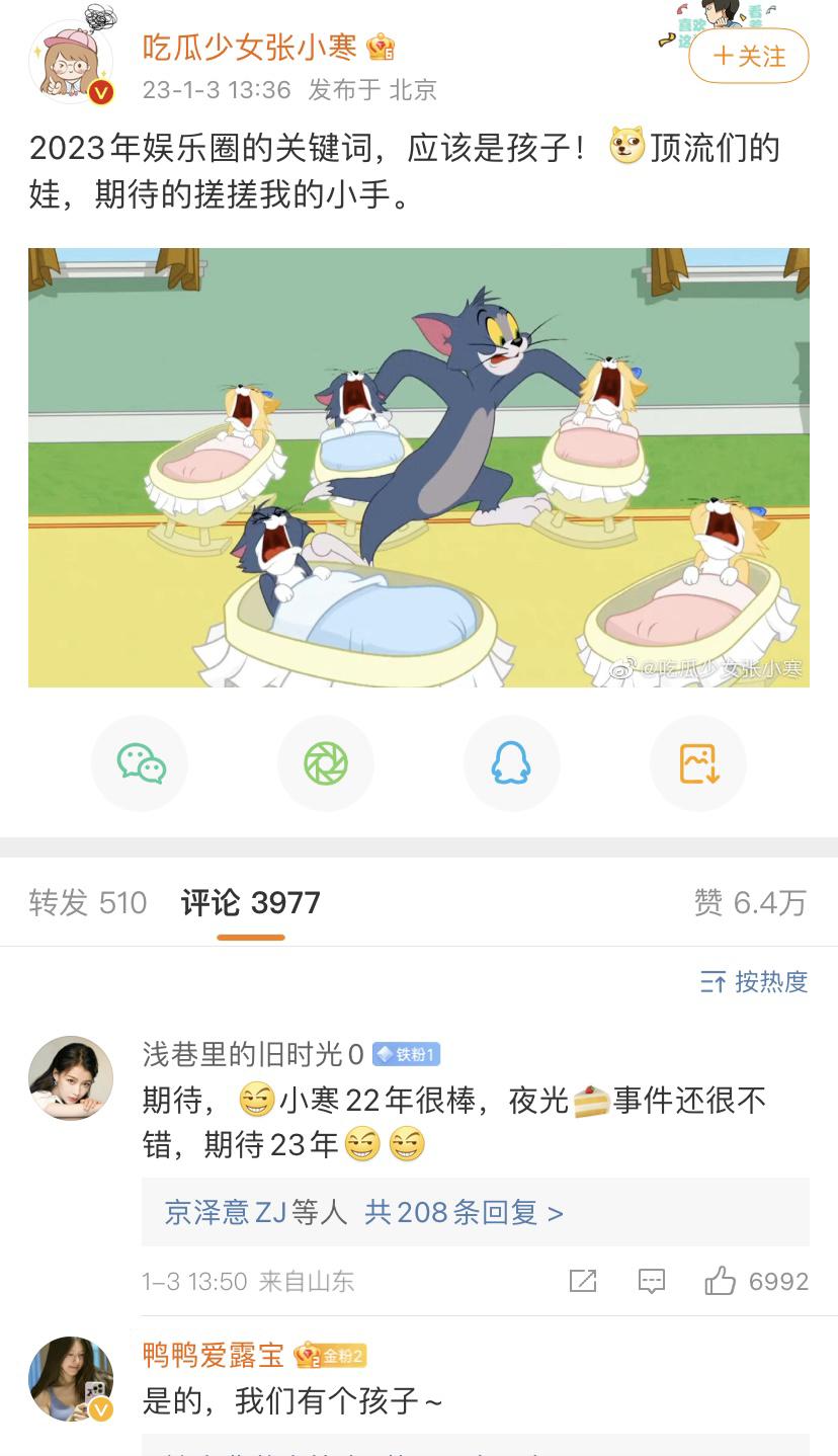 立足新的一年,“孩子梗”现象似有蔓延之势,让艺人私生活无处遁形。今年1月3日,张小寒发文说:“2023年娱乐圈的关键词,应该是孩子!顶流们的娃,期待的搓搓我的小手。”这一番预告,也拉开了“随时随地出现新孩子”在新一年的序幕。