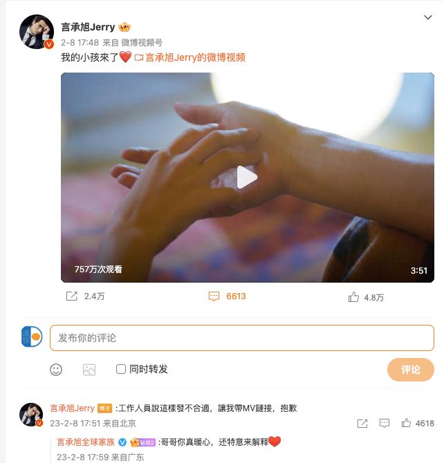 对此,网友们的反馈不一,有的表示理解:“哥哥你真暖心,还特意来解释”,有的受到“惊吓”,表示“吓死我了,我以为是你有孩子了”,也有的则表示不满,“言承旭是懂蹭热度的,好感-1”“新戏炒作,这种方式好下头,道明寺的滤镜破碎了……”